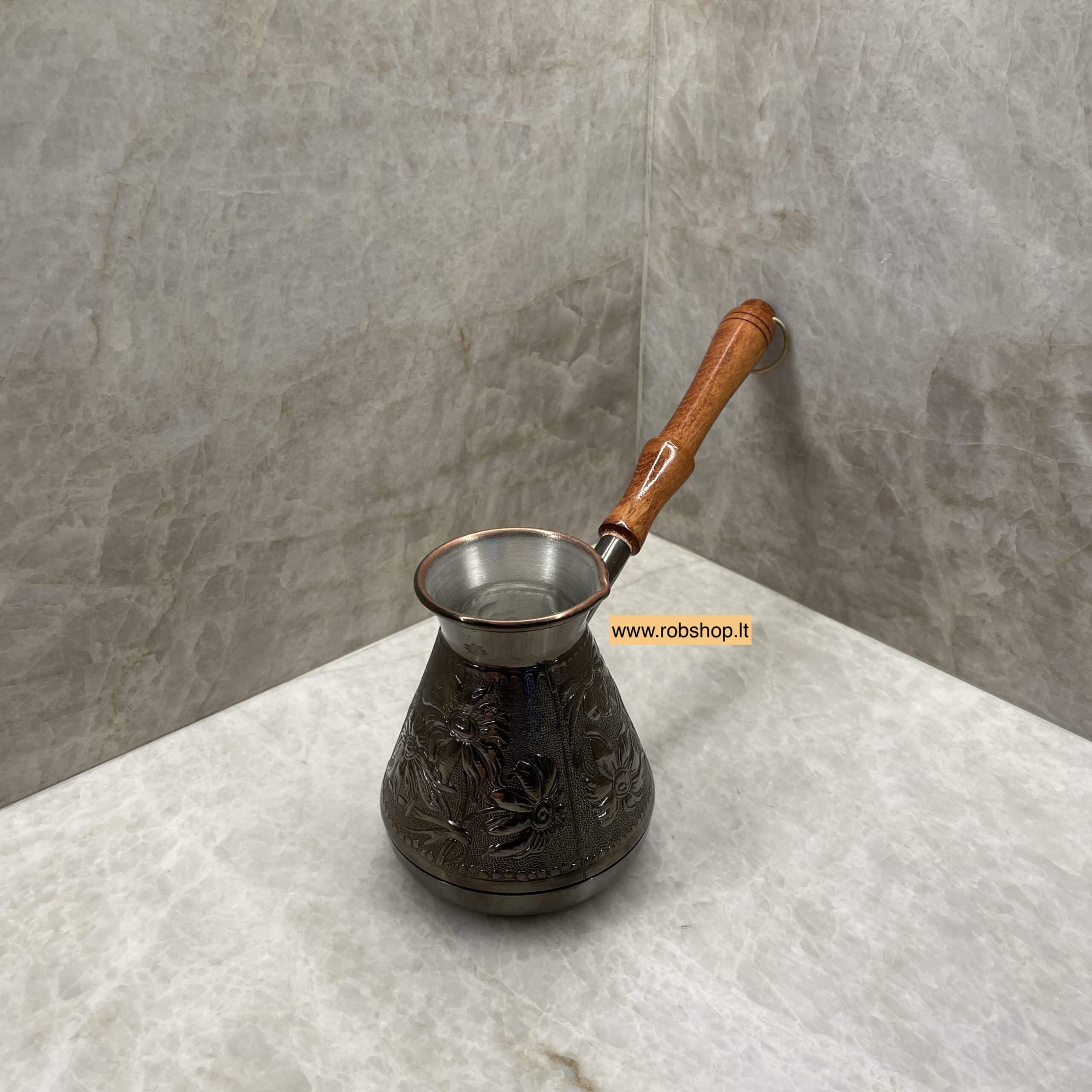 Originalus rankų darbo vario puodelis, viduje padengtas skarda, su medine rankena. Turkiškos kavos ruošimui, tūris – 400 ml. Patogus ir praktiškas, saugus naudoti. Netinka indukcinėms kaitlentėms. Negalima plauti indaplovėje. Pavaizduoti ornamentai nuotraukoje, gali skirtis realybėje.