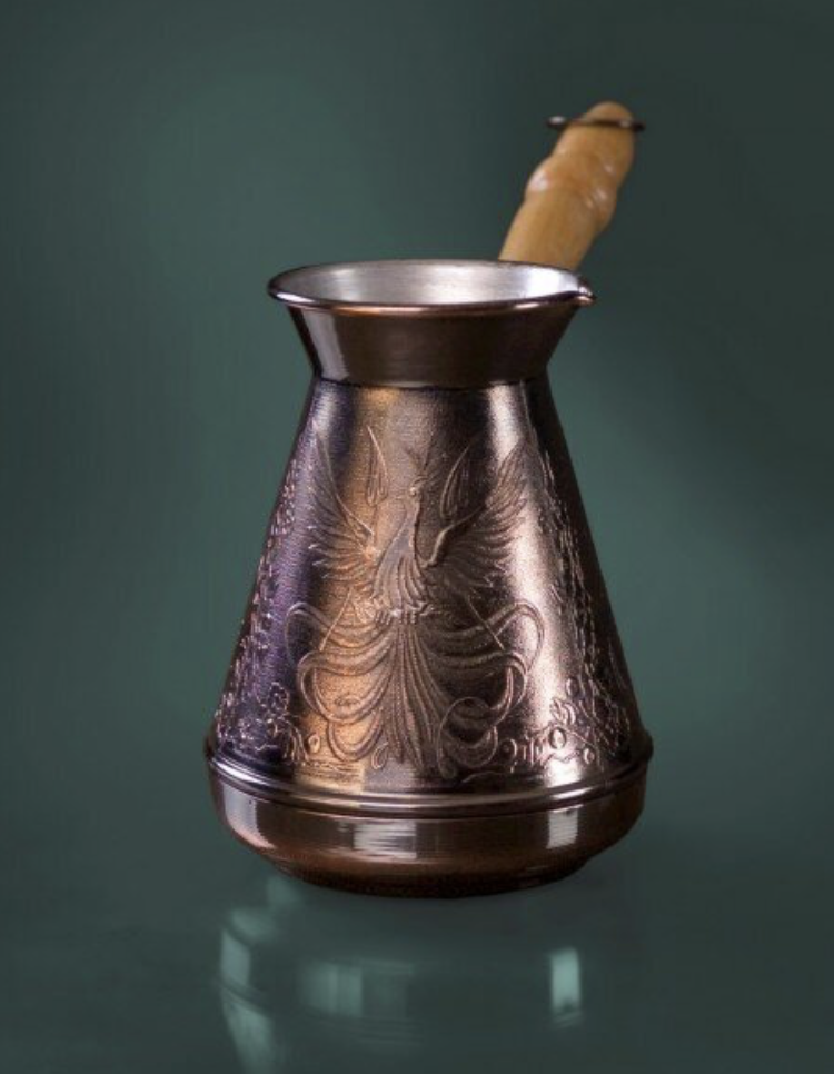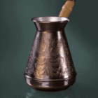 Originalus rankų darbo vario puodelis, viduje padengtas skarda, su medine rankena. Turkiškos kavos ruošimui, tūris – 640 ml. Patogus ir praktiškas, saugus naudoti. Netinka indukcinėms kaitlentėms. Negalima plauti indaplovėje. Pavaizduoti ornamentai nuotraukoje, gali skirtis realybėje.